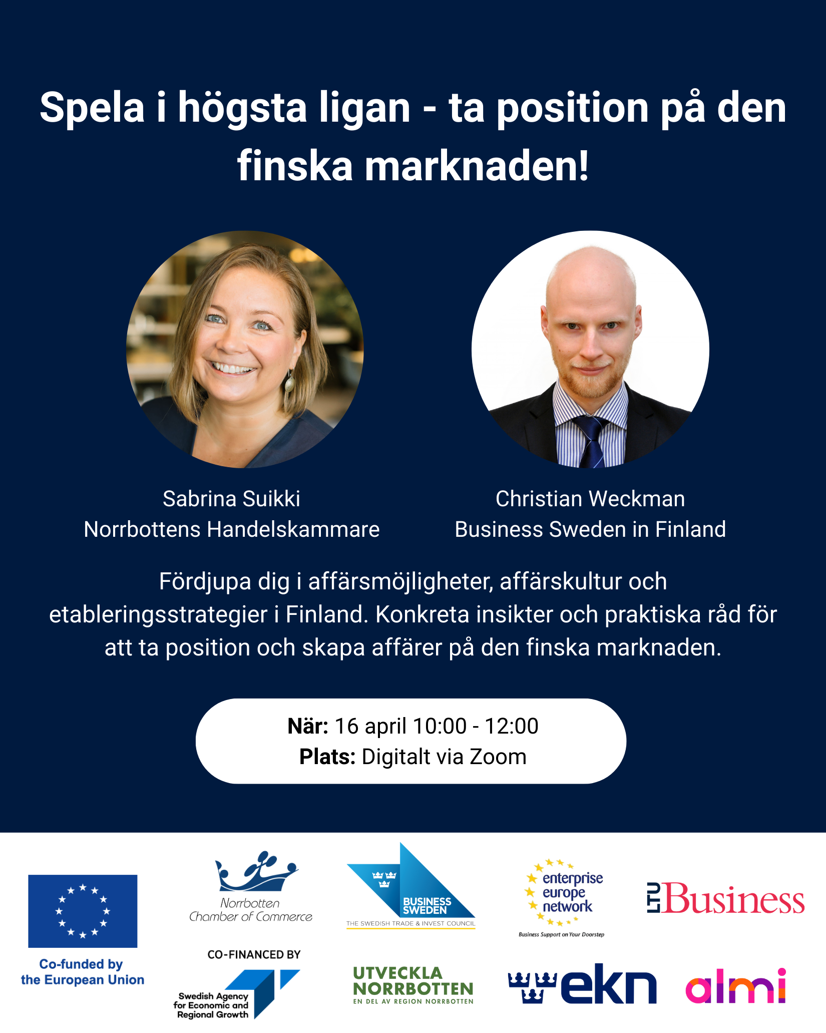 This session offers a broader business perspective combined with hands-on insights, delivered within the Team Sweden NorthNode collaboration together with Business Sweden in Finland and Norrbotten Chamber of Commerce in Sweden.